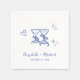 Romantic whimsical napkins for your engagement party, rehearsal dinner, wedding reception, etc., featuring french blue hand-drawn illustrations of a heart, stars and toasting wine glasses, and the names of the bride and groom in a playful script.