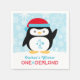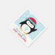 A maravilha de inverno "ONEderland", primeira design de guardanapo de festa de aniversário apresenta um pinguim ártico bonito vestindo um chapéu de Papai Noel e texto personalizado. O fundo tem um padrão de flocos de neve. Cor azul-gelo, turquesa, vermelha e branca com sotaques pretos e cinzas.