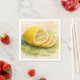 A watercolour lemon partially sliced to reveal music-paper segments, resting on a loose green leaf with shimmering juice droplets. A fresh, natural still life blending citrus brightness with musical harmony.
