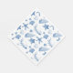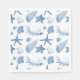 Este guardanapo de papel branco é mostrado em uma linda impressão de conchas azuis e brancas.