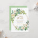 Este belo convite para salvar a data apresenta uma bela aquarela verde, flores brancas e uma coroa dourada. Tão elegante e bonito! Itens de partes correspondentes também estão disponíveis. © Mini Moi Impressões