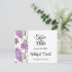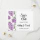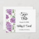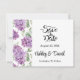 Salve o Cartão de Data é mostrado em um layout formal clássico no branco colorido com texto preto e texto de script destacando os nomes de noiva e noivo e acentuado com um adorável impressão de flores lilás. Personalize este item clicando no botão Personalizar edição, vá para a direita para as caixas de texto e altere o texto apropriado para o seu. Imagem licenciada