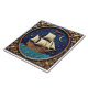 Um navio galeão com velas brancas e bandeiras vermelhas navegando em um mar ondulado sob uma noite estrelada com uma lua crescente, toda dentro a estrutura de ornamentado ouro.