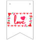 Esta guirlanda de bandeiras exibe a palavra “Love” em uma fonte de impressão única com letras vermelhas e contorno rosa dentro de um design de estilo retangular com corações temáticos vermelhos e rosas, rosas e coração em estilo morango em dois cantos neste tema do Dia dos Namorados. Todas as bandeiras têm impressão unilateral segura para uso ao ar livre e são feitas com corda de plástico grossa, tendo (16) bandeiras em forma de andorinha de 5,5" x 8" em uma corda de 1,8 metros de comprimento.
