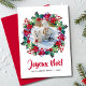 Guirlanda de Feliz Natal Fotos de cartões de Natal franceses Os cartões de Natal apresentam sua foto favorita rodeada por uma guirlanda floral em aquarela de azevinho, meias de Natal, poinsettias e bastões de doces em vermelho e verde festivos. Abaixo, em texto vermelho moderno "Joyeux Noël" com o nome da sua família e o ano abaixo em tipografia ameixa. Basta adicionar sua própria foto e editar o texto nas caixas de texto fornecidas. Criado por Evco Holidays www.zazzle.com/store/evcoholidays