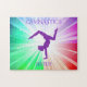 Luzes lindas coloridas quebra-cabeça com ginasta em roxo. Nome personalizado.