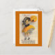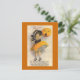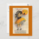 Lindo cartão antigo de Halloween mostrando uma menina vestida de amarelo e preto sendo surpreendida por um rosto de abóbora.