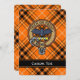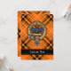 Crachá da crista de Halloween com morcego voador rodeado por uma correia e fivela sobre fundo tartano. Texto personalizado.