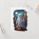 Au cœur d’une forêt automnale, sous un ciel nocturne éclairé par une lune pleine, un fantôme souriant se dresse fièrement. Son drap blanc flotte doucement dans la brise, parsemé de taches et de trous qui ajoutent à son charme spectral. À ses pieds repose une citrouille sculptée avec soin, dont les yeux et la bouche illuminés projettent une lueur chaleureuse sur le sol forestier. Des feuilles d’oranger tombées encadrent la scène, tandis que des chauves-souris silhouettées volent au loin, complétant cette célébration visuelle de l’esprit d’Halloween.