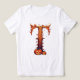 This is a festive, spooky illustration featuring an ornate, glowing orange letter 'T' that looks like an ancient, horned pillar, decorated with autumn leaves and vines. It is centered above two glowing, grinning jack-o'-lanterns nestled in a pile of fallen leaves against a dark, hazy teal background.