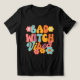 Halloween Bad Witch Vibes Retro Groovy Typografia Feminina T-Shirts mostra o texto "Bad Witch Vibes" numa escrita colorida tipografia destacada por flores e crânios. Perfeito para festas de Halloween e comemorações. Elaborado por ©Evco Holidays www.zazzle.com/store/evcoholidays