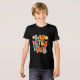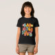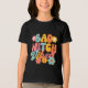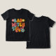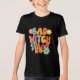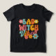 Halloween Bad Witch Vibes Retro Groovy Typoographic T-Shirts femininas exibe o texto "Bad Witch Vibes" em uma escrita colorida tipografia acentuada por flores e crânios. Perfeito para festas de Halloween e comemorações. Elaborado por ©Evco Holidays www.zazzle.com/store/evcoholidays