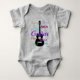 HAMbyWhiteGlove desenhou camiseta com gráfico de guitarra preta e modelos a que você pode adicionar seu nome, ou deixar as coisas bonitas de torta que escrevemos, "Guitar", "Rock on" "sing", "dance", "sorriso", "abraço", "toca" e "brilha", guitarra," sobre isso! Muito divertido! Mostrada em uma camisa listrada de cinza escura, para sua guitarra tocando bebê!