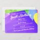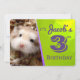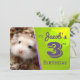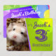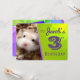 É o seu cartão de convite de hamster de aniversário. Design com um hamster branco e castanho peludo. O fundo é um design geométrico roxo brilhante e colorido. O dorso é decorado com balões coloridos flutuando até o céu sobre formas geométricas azuis. Aqui, você também pode colocar informações detalhadas sobre a parte: nome, localização, data, hora etc.