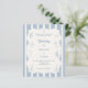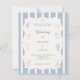 A hand drawn style wedding invitation with beach, coastal theme. A soft ivory and dusty blue striped colored background, with an ivory frame and dusty coastal blue elements. Personalize and add your names and the details.