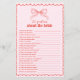 Add festive fun to your celebration with this red and pink hand drawn bow 20 Questions About the Bride game, perfect for a Christmas bridal shower, winter wedding shower, or festive holiday gathering. A sweet activity for a merry little bridal shower, this quiz invites guests to share cute memories and fun facts. The warm seasonal palette and playful bow accents make it ideal for cozy winter parties and holiday-inspired bridal events.