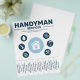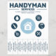 A professional handyman services flyer with tear-off tabs in light & bold blue color. A clean & modern design with a central home icon, surrounded by icons representing different repair tools including water drop, electrical symbol, paint roller, handsaw, hammer and wrench.