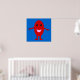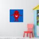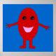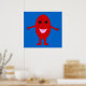 A cartoon of a smiling red grape with shiny black eyes and a pink mouth standing against a blue background with its arms open wide. This is a vibrant colorful poster that should put a smile on your face.