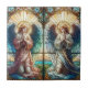Este trabalho de arte, embora parecendo vidro manchado, é na verdade um azulejo cerâmico projetado para imitar a beleza eterno da vidraça tradicional. A peça retrata dois anjos ajoelhados em oração, suas mãos delicadamente amarradas em devoção. O anjo da esquerda veste um manto cor-de-rosa e vermelho fluente, complementado por asas em tons de azul e verde, enquanto o anjo da direita é encaixado em um manto azul e branco sereno com asas coloridas semelhantes. Atrás deles, um padrão radiante de explosão solar banha a cena em luz quente e divina. Abaixo, desdobra-se uma paisagem pitoresca, com um rio enrolado cortando-se através de um verde-luxuoso. Embora possa não ser um vidro manchado autêntico, o intricado artesanato do azulejo e o uso cuidadoso da cor criam uma ilusão espantosa. O detalhado revestimento e acabamento texturizado evoca o efeito luminoso da passagem da luz pelo vidro, permitindo que esse trabalho de arte cerâmico tenha o mesmo apelo espiritual e artístico.