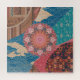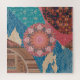 Um Quebra-cabeça impressionante mostrando a fusão de padrões marroquinos em tons ricos de terra, ondas japonesas em tons azuis, e mandalas indígenas em laranjas e púrpuras vibrantes.
