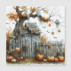 Harvest Haunt - Onde Pumpkins brilha e fantasmas lançam um cartão magnético do Dia das Bruxas Uma velha casa de madeira fica presa e vigilante, cercada por uma cerca de picete quebrada enredada enredada em teias de madeira. As lanternas brilhantes sopram no chão e penduram nas ramificações do outono, seus rostos esculpidos tremendo de malícia. As figuras fantasmagóricas saem das árvores, e os morcegos cortam através do céu. Barris e cestos transbordam com abóboras e relíquias de colheita, enquanto as folhas de laranja se espalham como sussurros da estação. A cena combina encanto rústico com prazer espectral, capturando a tranquilidade do Halloween num momento de decadência festiva.
