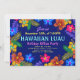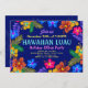 Convites de festas de luau havaianos personalizados com modelos coloridos de borda de hibisco e texto. Convide funcionários para uma festa de férias com um tema tropical, ou atire uma festa de aniversário de luau. Personalize o texto para qualquer celebração do tema da ilha, basta mudar o texto de "festas de férias" para qualquer evento. Os cartões horizontais são azuis-roxos escuros em ambos os lados, com flores e folhas grandes coloridas.