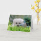 Este Cartão de Aniversário bonito apresenta Hermes, um doce Cachorro Maltês. Ele está deitado na grama brincando com sua bola azul mole.