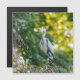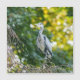 Uma erva cinza percorre graciosamente um galho de árvore, cercada por uma mistura de folhas verdes e ouros. O mastro em segundo plano melhora a atmosfera pacífica, destacando a elegante postura da ave e as penas impressionantes num cenário de outono.