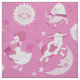 Este tecido das crianças ilustradas caracteriza alguns de seus favoritos do ganso de mãe em uma paleta de cores cor-de-rosa brilhante. É perfeito para todo o berçário ou sala da criança.