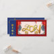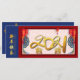 Padrão chinês em tom azul em ambos os lados opostos com lanternas vermelhas, ideogramas chineses cor-de-rosa pálido como fundo, grande ouro 2021 + dois pequenos ouros Ox recortados em papel (imagem impressa) + desejos em chinês e inglês. Design na placa lisa retangular com caixa grande e outra mensagem com o nome da família para personalizar na parte traseira da placa. Cartão de saudação, cartão postal e outros cartões planos.