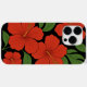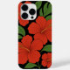 O hibisco vermelho-escuro floresce com estames de ouro e folhas verdes escorridas pop contra fundo preto profundo. Um design floral impressionante perfeito para impressões tropicais, moda ou decoração elegante.