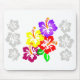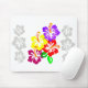 Padrão floral colorido de hibisco tropical em cores púrpura, vermelha, laranja, magenta e amarela.