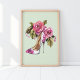 Modisches Aquarell Poster: Ein eleganter High Heel, verziert mit pinken Blumen, auf einem frischen mintgrünen Hintergrund – perfekt für moderne Wohnräume.
