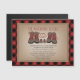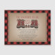 Ilustração de um par de botas para bebês entre dois pares de botas para caminhada adulta com cadarços vermelhos dispostos em forma cardíaca. O estoque de papelão é inspirado na borda de xadrez de búfalos vermelho e preto. O texto vermelho no topo diz, "A aventura começa"