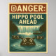 Warning: hippos ahead! This poster is a playful tribute to a river adventure, featuring hippos and a bold vintage-style warning sign. Designed with retro flair and theme park humor.