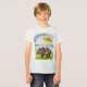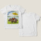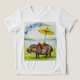 The image is a watercolor illustration of a hippopotamus with a saddle and a yellow umbrella. The hippopotamus standing next to water, with mountains in the background and blue flowers framing the scene.