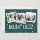Cartão com fotos festivo de feriado apresenta três fotos quadradas em um layout de colagem, com "torcida de férias" em letras brancas e brancas em um fundo verde de caçador. Personalize com seus nomes e o ano na base.