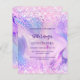 Um convite feminino da Quinceañera. Na frente: Um fundo holográfico colorido em roxo, rosa. Decorado com confete cor-de-rosa penteado. Personalize e adicione um nome e detalhes da parte. O nome é escrito com um script de estilo manuscrito, letras cor roxa. 1 folha = 1 convite impresso de borda a borda.