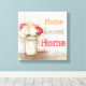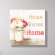 Home Sweet Home Country Mason Jar com Arco de vinho e Canvas de Rosas. Esta é uma peça perfeita de arte de decoração de campo. Ele tem muito charme de vintage country com pote de latas, rosa e arco de fio. As cores são coral de pêssego, creme e salmão rosa. O fundo é um olhar aflitivo de madeira de celeiro.