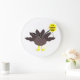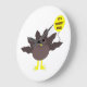 Este relógio fantástico mostra um desenho engraçado de um peru com grandes olhos pretos, um pequeno bico amarelo e penas de cauda grudadas. Os pés estão voltados em direções opostas, fazer o peru parece desajeitado. O peru está segurando um balão amarelo com um dentro de mensagem que diz "é hora do peru". Esta é uma design de festa de ação de graças divertida.