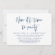 Cartão de convite de casamento com tema de escrita azul naval moderno (Agora é hora de festejar). É perfeito para o seu jantar de casamento informal à beira do lago, dança e festa.