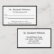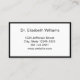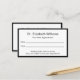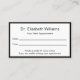 O cartão de médico profissional é duplo. Ambos os lados têm uma elegante borda negra. Lado um tem uma linha de texto para o nome do médico ou da clínica médica. A segunda linha de texto diz "Seu Próximo Compromisso". O lado dois também tem linhas para a data e hora do compromisso. Na parte inferior, há texto de exibição que você pode editar para criar uma mensagem personalizada, se desejar. (Mostrado: Tenha gentilmente 24 horas de antecedência se não conseguir manter seu compromisso.) O lado dois tem texto a apresentar para substituir pelo nome do médico (ou nome da prática) e o endereço, número de telefone e sítio Web. Todo o texto pode ser editado ou excluído. O texto é preto.