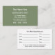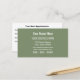 Este cartão de compromisso profissional moderno é fácil de personalizar online antes de fazer pedidos. A frente da placa apresenta texto branco sobre uma cor de fundo verde de sábio. Se você precisar alterar o verde do sábio para a cor da sua empresa/marca, role para baixo no modelo de personalização e clique em "Editar usando a ferramenta Design" e ajuste de acordo com isso antes de fazer o pedido. A parte de trás do cartão de compromisso contém texto preto com linhas pretas, organizadas em um layout legal, com espaços para data(s) de compromisso e hora(s) a serem escritas manualmente quando o cartão estiver em uso.