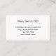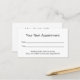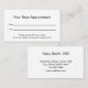 O cartão de médico profissional é duplo. O lado um diz "Seu Próximo Compromisso" e tem linhas para a data e hora do compromisso. Na parte inferior, há texto de exibição que você pode editar para criar uma mensagem personalizada, se desejar. (Mostrado: Tenha gentilmente 24 horas de antecedência se não conseguir manter seu compromisso.) O lado dois tem texto a apresentar para substituir pelo nome do médico (ou nome da prática) e o endereço, número de telefone e sítio Web. Todo o texto pode ser editado ou excluído. O texto é preto. O cartão de lembrete de compromisso é branco.