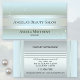 Um cartão de visita elegante com design azul-prateado listrado sobre fundo azul verde com cinzas prateadas. A parte traseira do cartão está configurada para anotar compromissos. Se não precisar disso, você pode excluir ou personalizar os textos e/ou a imagem. Também é possível copiar/colar uma imagem para o outro lado do cartão.