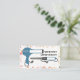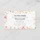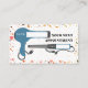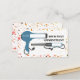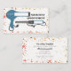 Um cartão de visita com um plano de fundo de padrão terrazzo com esquema de cores inspirado no deserto, na frente e atrás. Informações de contato dos recursos traseiros. A frente apresenta um secador azul de descarga e um ferro de enrolamento correspondentes ao tempo e à data de marcação.
