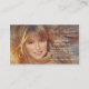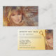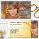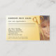 Cartão de visita personalizável com uma jovem mulher/rapariga com cabelo radiante e um par ouro de tesouras (que pode apagar na frente se não gostar). A parte traseira da placa tem espaço para adicionar compromissos.