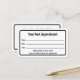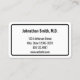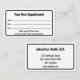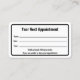 O cartão de médico profissional é duplo. Ambos os lados têm uma fronteira negra. Lado um diz "Seu Próximo Compromisso" e tem linhas para o nome do paciente, data e hora do compromisso. Na parte inferior, há texto de exibição que você pode editar para criar uma mensagem personalizada, se desejar. (Mostrado: Tenha gentilmente 24 horas de antecedência se não conseguir manter seu compromisso.) O lado dois tem texto de exibição que você pode substituir pelo nome do médico (ou nome da prática) e seu endereço, número de telefone e site. Todo o texto pode ser editado ou excluído. O texto é preto.
