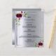 Um cartão de cardápio do estilo boêmico elegante. Penas e rosas de cor aquosa em burgundy. Modelos para seus nomes, data e menu de casamento. Um falso quadro prateado e um fundo metálico chic, falso glamouroso e magro, de aspecto prateado. Letras pretas coloridas. Fundo: fundo metálico prateado falsa.