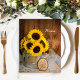 Personalize o encantador Menu de Casamento de Girassóis e Águas de Jardim com os detalhes da refeição que você servirá no seu verão ou fazenda de outono ou chá de panela de rancho, poste o brunch de casamento ou o janto de recepção de casamentos, adicionando a salada ou o primeiro curso, a entrada ou o segundo curso e a sobremesa ou o terceiro curso. Este menu nupcial rústico personalizado da chic do país apresenta uma fotografia floral melhorada digitalmente de um lençol de metal que pode ser repleto de flores de girassol amarelas, véu de brasa branco, fatia de madeira natural com a palavra LOVE queimado sobre ela e um lenço vintage com lenço de linho desbastado com um fundo de burlap e madeira meteorizada. Perfeito para o seu evento casual de celebração do celeiro.